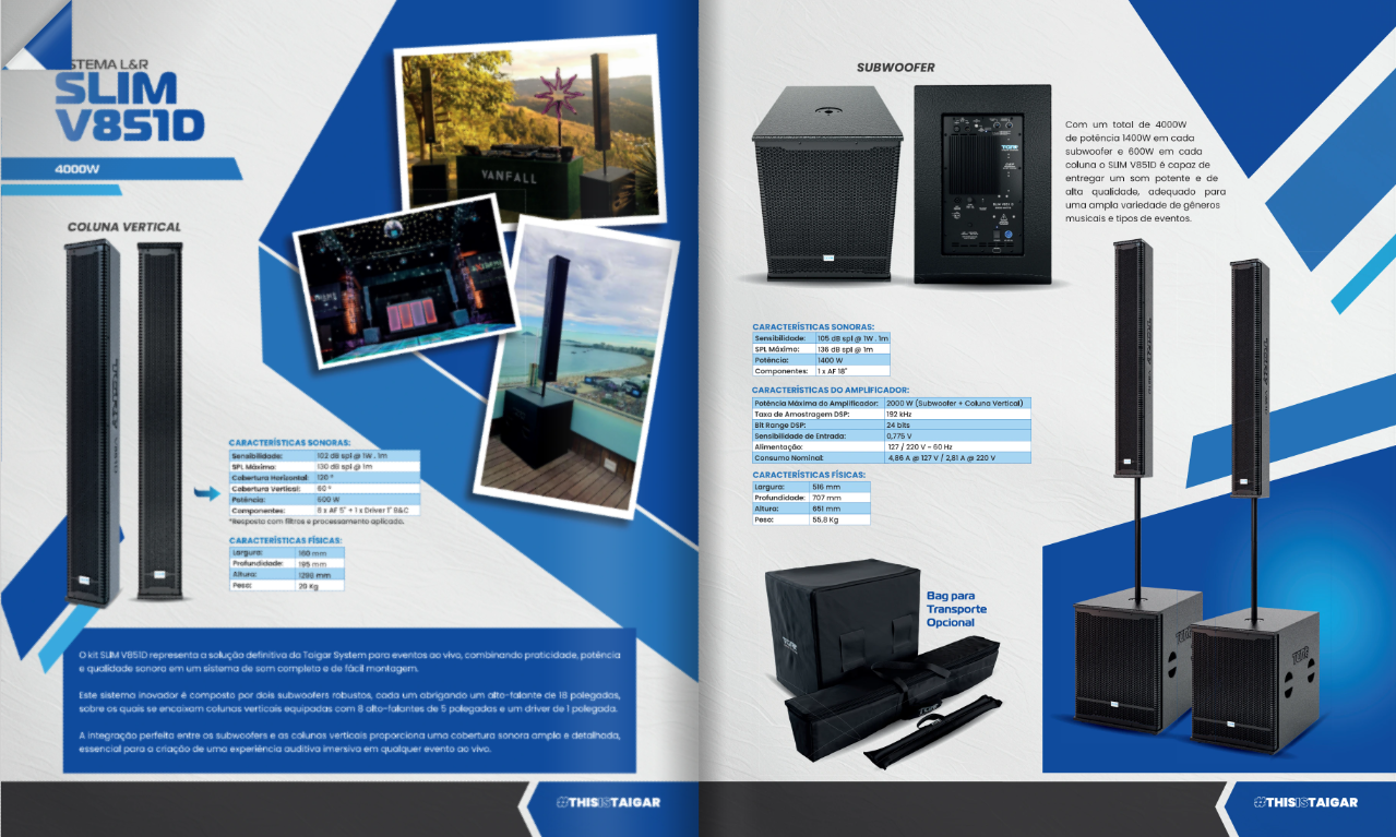 O sistema vertical V851D é revolucionário, alcançando potência e qualidade sonora até então inconcebíveis para as linhas slim no mercado. Gerenciado por um DSP dedicado, o conjunto bi-amplificado conta com 1 Subwoofer de 18" e uma coluna vertical com 8 woofers de 5" mais 1 driver de Polyimide da B&C Speaker´s. Suas configurações geram um timbre único e característico TGR.